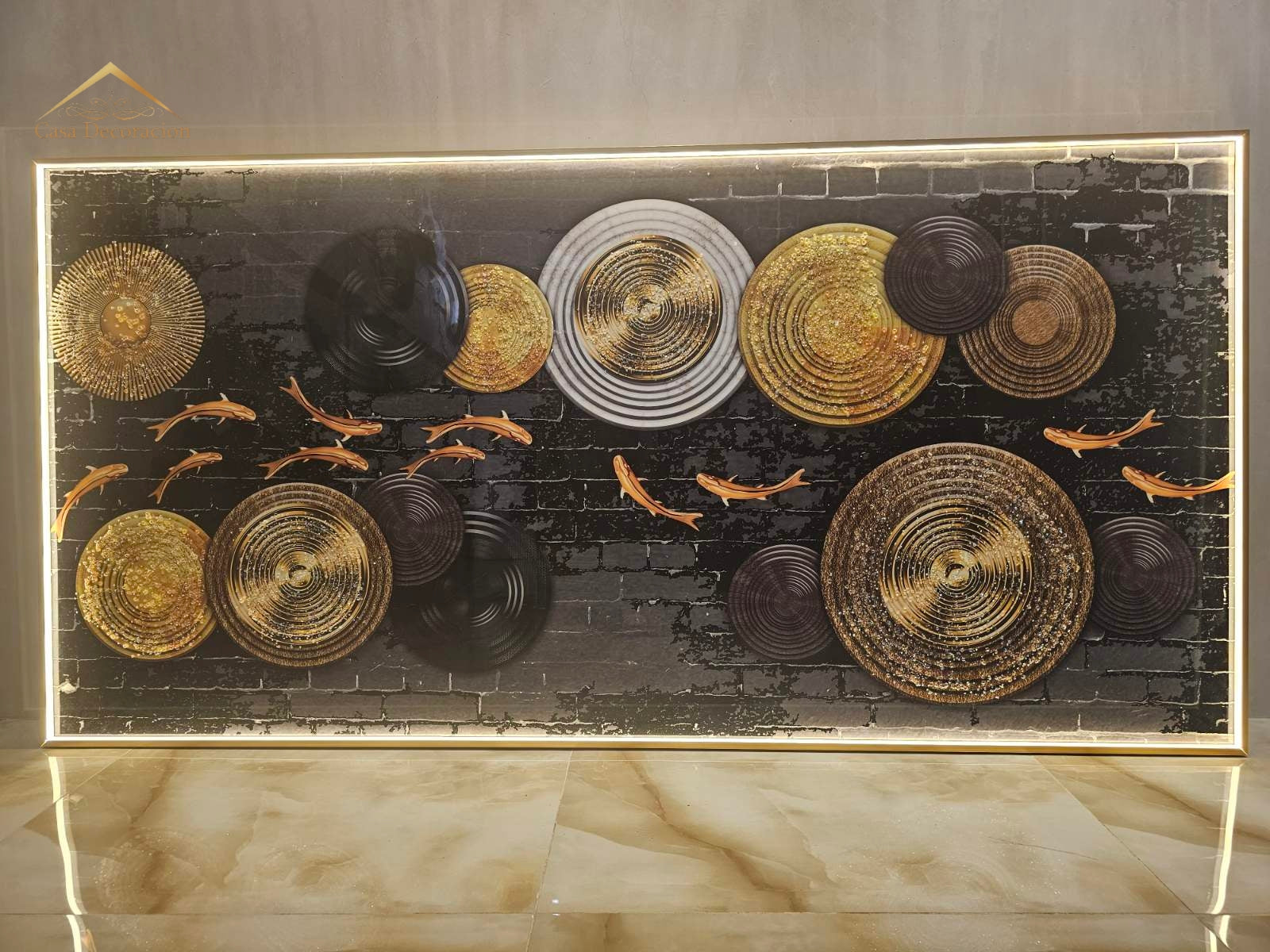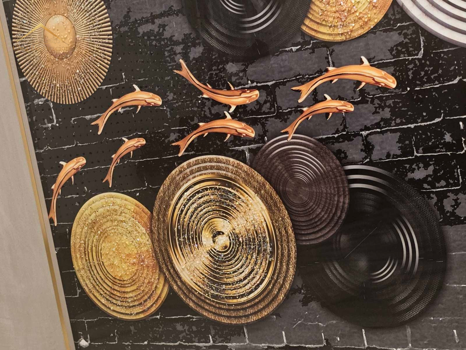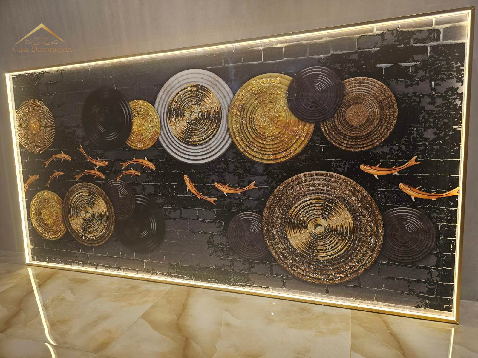 Golden Koi Fishes Horizontal Frame 3d Embossed Beads W/ LED Light