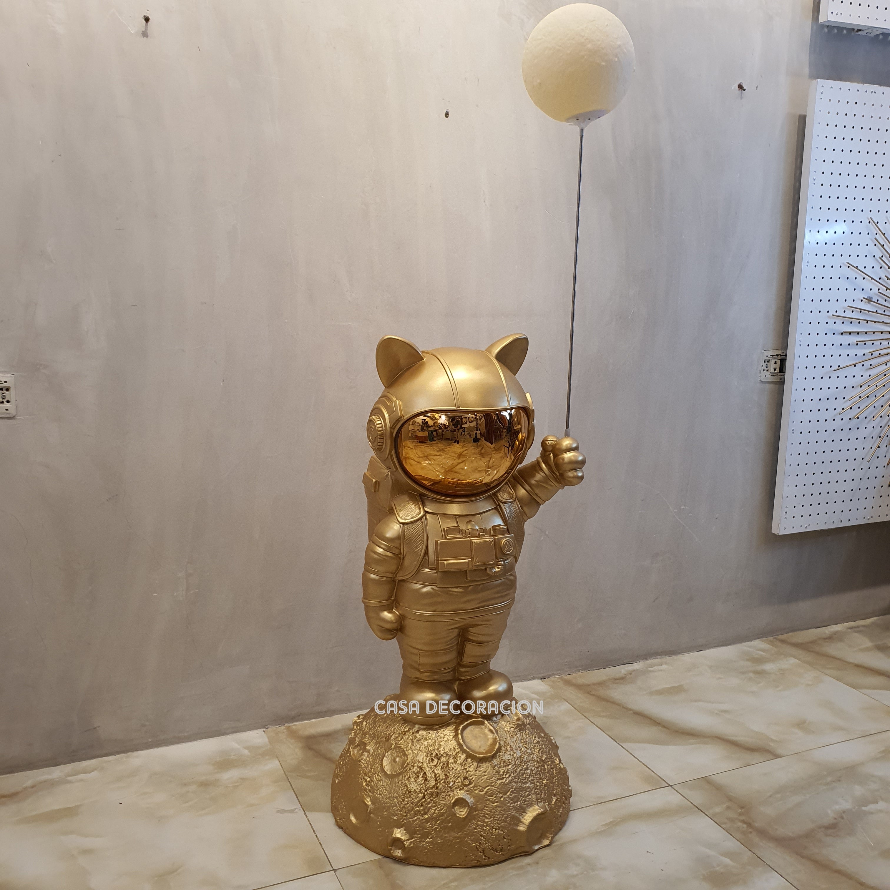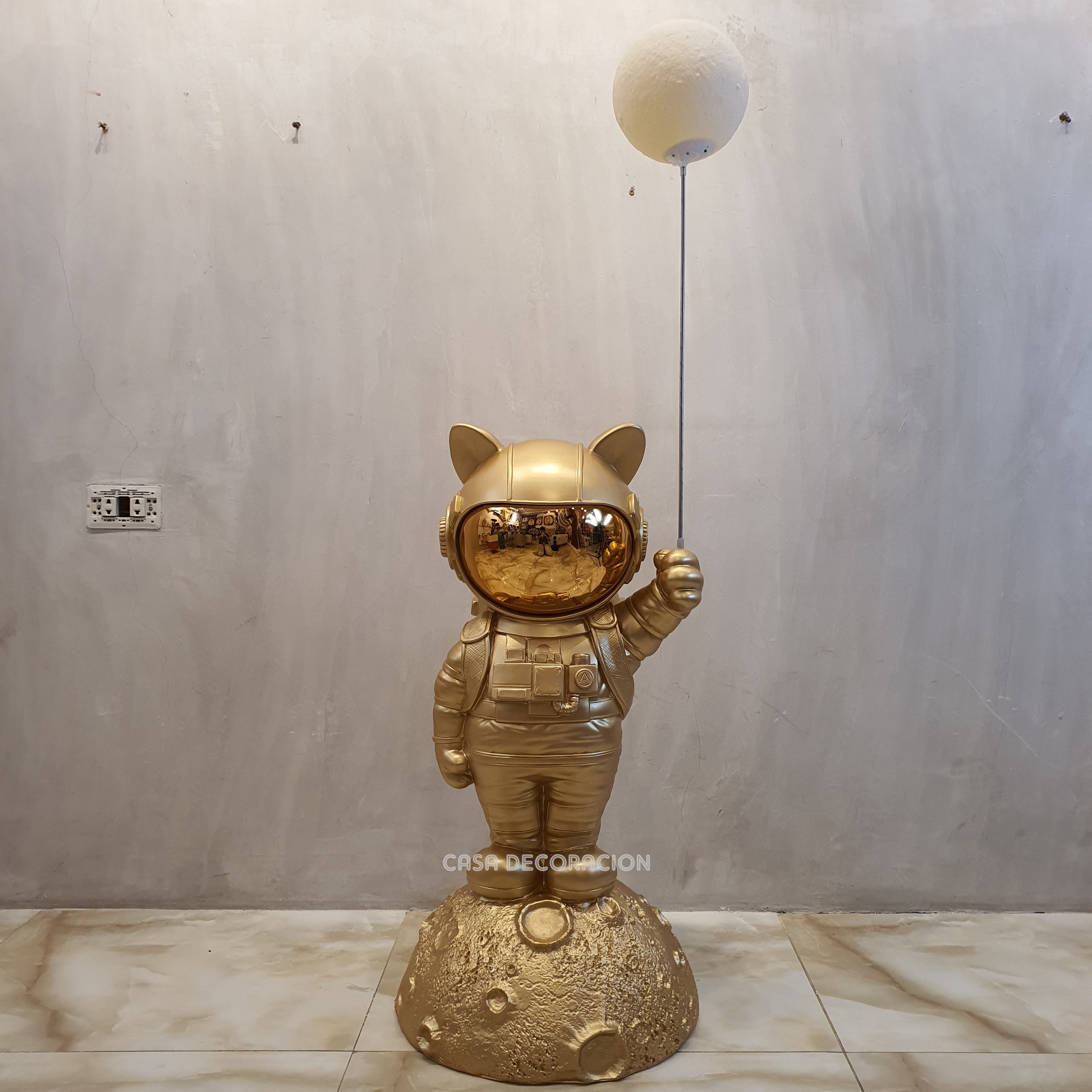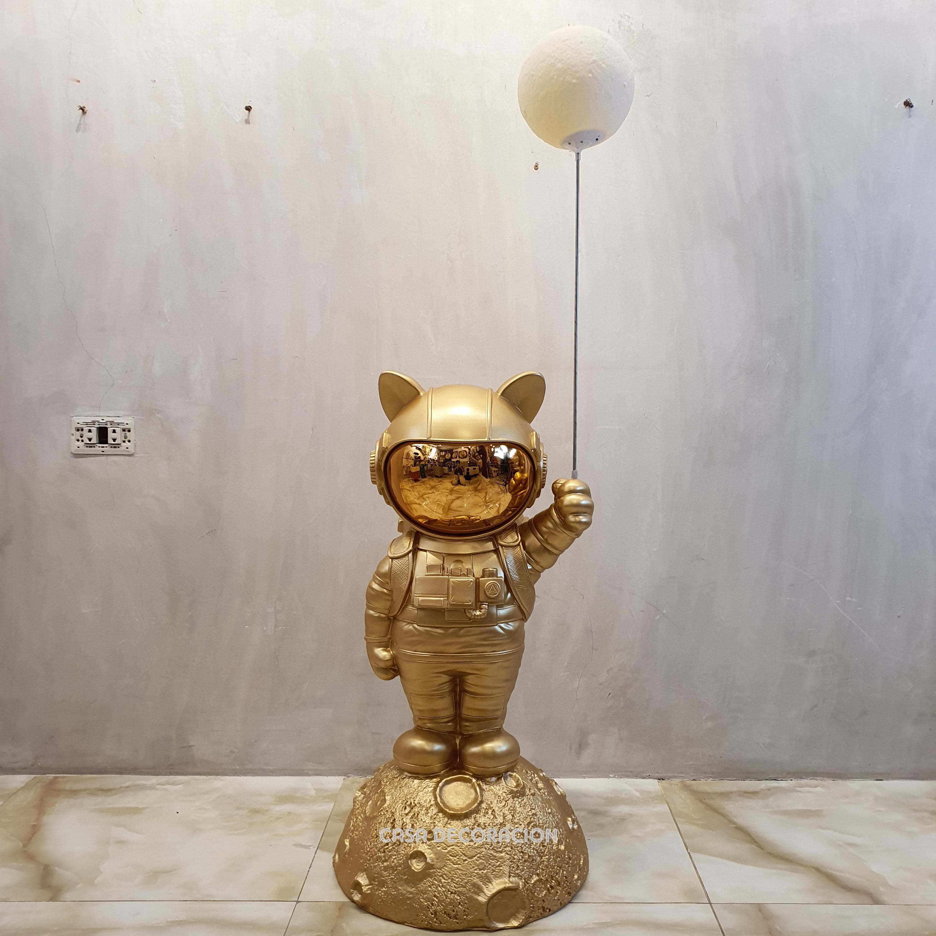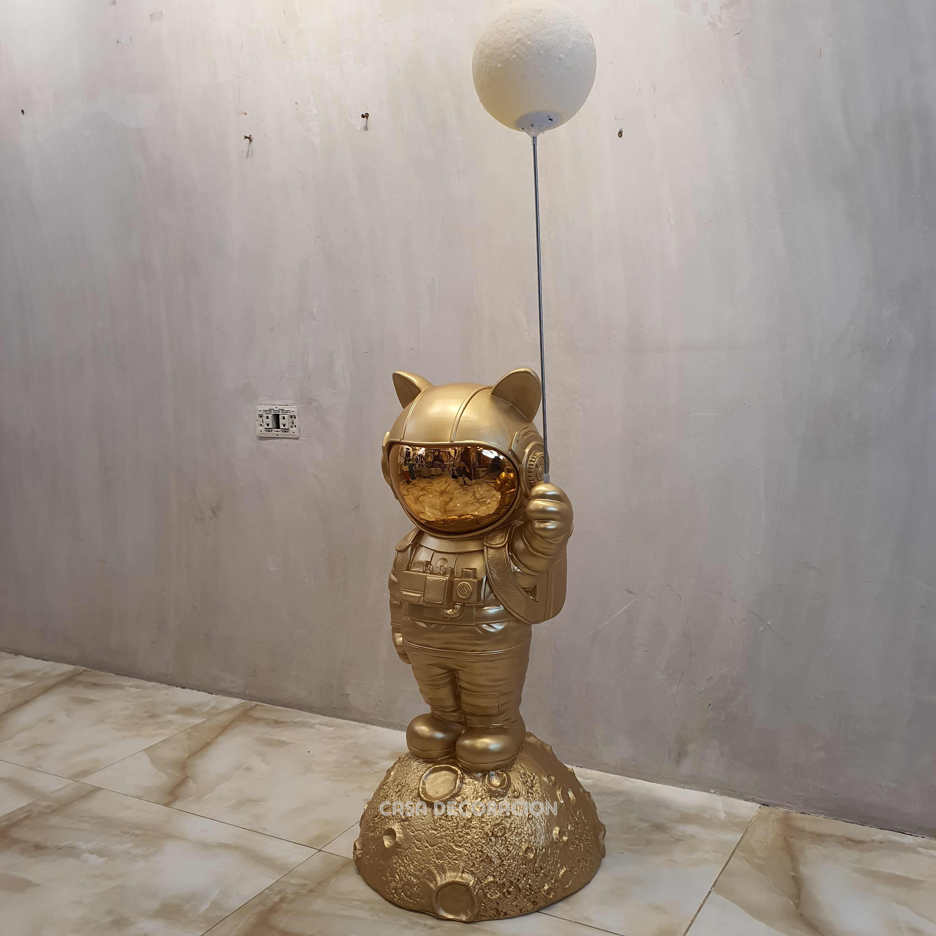 A striking gold astronaut statue floor lamp that pairs luminous lighting with sculptural design — perfect as a centerpiece in contemporary or eclectic interiors.